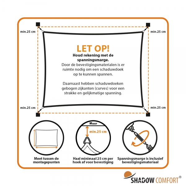 Ben jij op zoek naar een schaduwdoek van 2x3 meter? Met de schaduwdoeken van Nettenverkoop creëer je eenvoudig een koele plek in jouw tuin of op jouw balkon. Kies uit 10 verschillende kleuren en jouw schaduwdoek wordt binnen 2 werkdagen geleverd. Let er wel op dat schaduwdoeken een curve hebben, zodat het doek goed opgespannen kan worden.